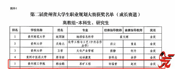 2月26日-27日,由贵州省教育厅主办,贵州师范大学、贵州装备制造职业学院承办的第二届贵州省大学生职业规划大赛省级决赛上,我校3名选手脱颖而出,最终斩获高教组金奖2项(成长赛道1项,就业赛道1项)、铜奖1项(成长赛道)。