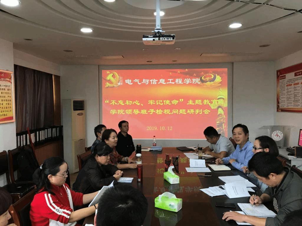 本网讯(电气与信息工程学院 周新国)按照学院“不忘初心、牢记使命”主题教育工作安排,10月12日下午,学院召开了“不忘初心、牢记使命”主题教育学院领导班子检视问题研判会。院领导王婷婷、蒋学勤、张均、周新国参加会议,学院党总支委员、专业负责人、各科室(实验中心)、教研室负责人,民主党派代表、教师代表参加会议。会议由学院党总支书记王婷婷主持。