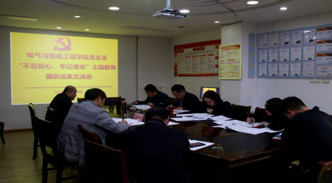 本网讯(电气与信息工程学院 文/石明尧 图/郑旭)10月30日,电气与信息工程学院“不忘初心、牢记使命”主题教育调研成果交流会在723会议室召开,校第四巡回指导组组长刘承章莅临指导并讲话,学院领导龙飞、张均、周新国出席会议,学院党总支委员、各科室(实验室)负责人、教研室负责人参加会议,会议由党总支书记王婷婷主持。