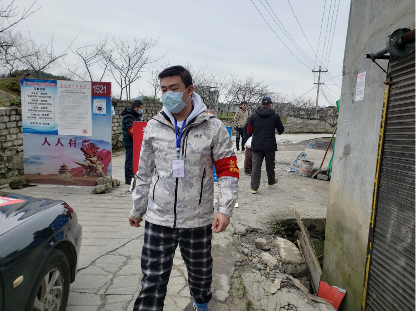 本网讯(电气与信息工程学院)电气与信息工程学院电自185班李杜,遵义市红花岗区桃溪人。一个看起来大大咧咧的大男孩,但做起事来认真细致。2020新型冠状病毒急速蔓延之际,其所在桃溪社区组建志愿者活动,他知道后,第一个跑到社区积极报名,并和社区的叔叔阿姨们一起组成了“抗肺炎.做志愿,我在行动”的志愿者活动。
