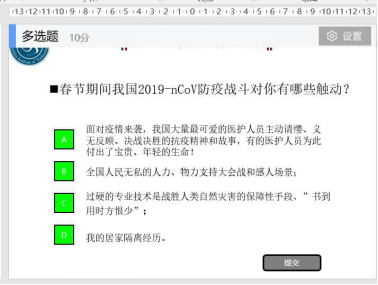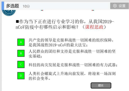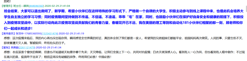 课后,同学们这样反映在特殊时期的开学第一课。“老师们就当前形势抛出了“如何战胜疫情”这一问题,通过分析中国历史、西方经验以及当前战胜疫情“七大法宝”等进行了专题分享”,“ 整堂课生动有趣,逻辑思路清晰,为当前疫情防控作出了专业的分析。”,“老师准备的很充分”“虽然网络时不时有点小卡,但这种特殊的上课方式,更加有利于学生们自律能力和自主独立学习习惯的养成。” “给老师点赞,快冲到20万了”…