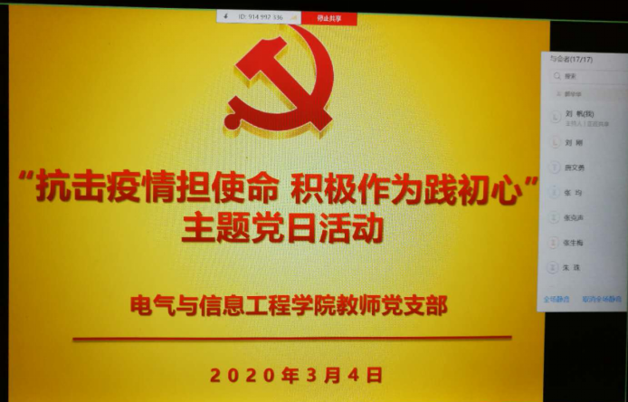 本网讯(电气信息工程学院 郭华华)2020年3月4日晚,为进一步学习贯彻党中央、省委关于新型冠状病毒疫情防控工作决策部署,落实学校疫情防控工作相关要求,在学院党总支的统一安排部署下,我院教师党支部通过Welink视频会议系统,围绕”抗击疫情担使命、积极作为践初心“主题开展了一次特殊的主题党日活动。