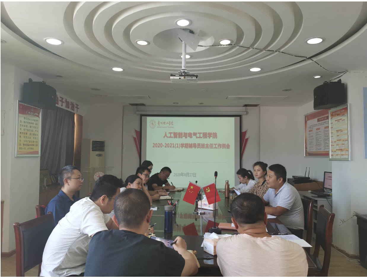 (本网讯 人工智能与电气工程学院 顾英)为进一步规划好2020-2021(1)学期学生工作,安排好新学期学院各项学生工作,做好疫情常态化学生管理工作,2020年8月27日,我院在723会议室召开本学期辅导员班主任工作例会,全体辅导员班主任参加会议,党总支副书记周新国出席会议,学生科副科长顾英老师主持会议。