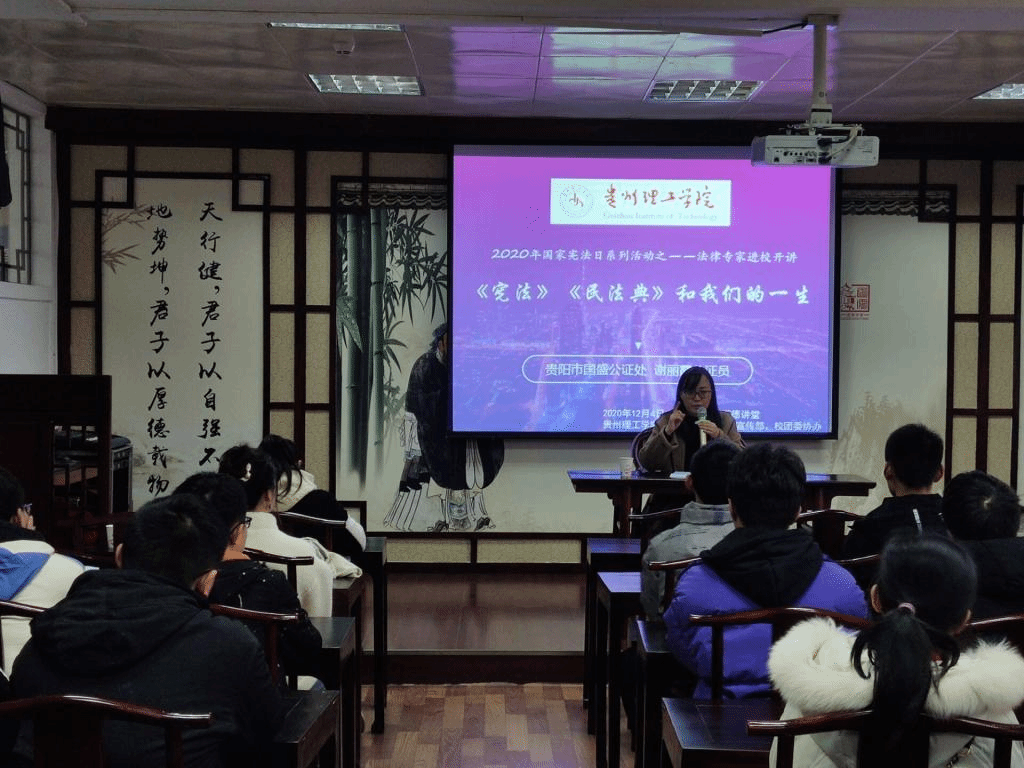 本网讯(人工智能与电气工程学院 高祥)2020年12月4日,在第七个国家宪法日来临之际,由学院办公室主办,党委宣传部、校团委协办,人工智能与电气工程学院承办的法律专家进校园活动在蔡家关校区道德讲堂召开。来自贵阳市国盛公证处执业公证谢丽霞女士为师生做了一场题为“《中华人民共和国宪法》《中华人民共和国民法典》与我们的一生”主题讲座。