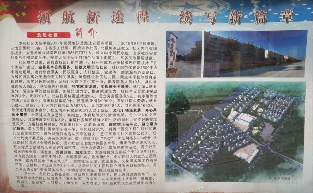 通过宣传栏实践小队了解到,龙形社区实施“三就一保”举措,围绕“搬得出、稳得住、能致富”,先后在易地移民搬迁点建设学校、完善卫生服务中心、招引扶持扶贫车间、改善社区办公条件,全面帮助解决搬迁群众就学、就医、就业、公共保障服务问题,有效提升易地移民群众的幸福生活指数。