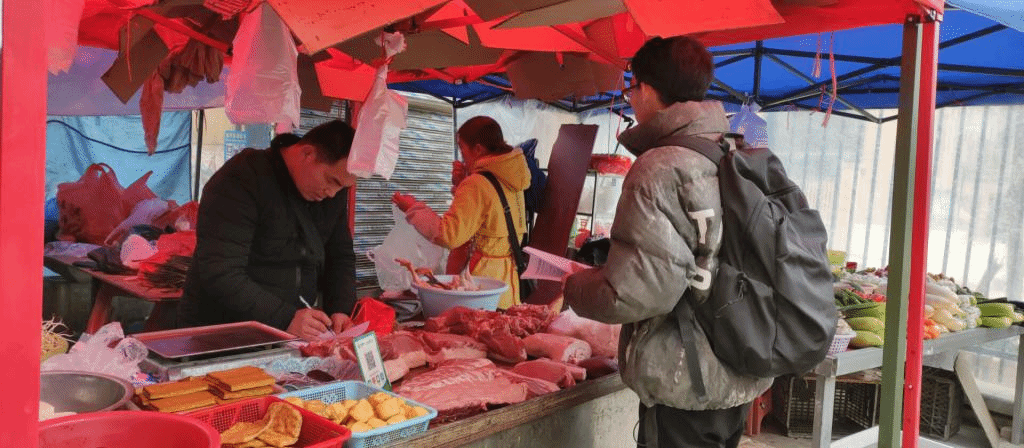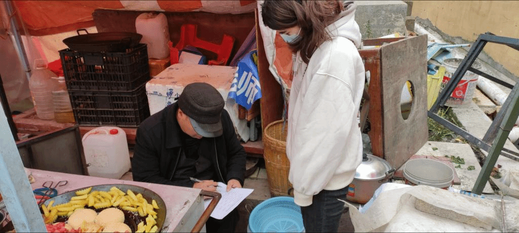 在社区街边,摆着各种摊子,有早餐、各种蔬菜水果、各种肉类以及一些常用的工具等。而经营者大部分是由上了年纪的大爷大妈,通过询问和填写问卷得知,他们因为年龄超过了社区工厂接收的最高年龄,不能在社区里工厂工作,所以摆摊能够为他们提供一定的收入。由于大部分是大爷大妈,所以会存在不识字的情况,需要成员口述问卷的题询问后再代填问卷。