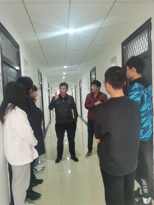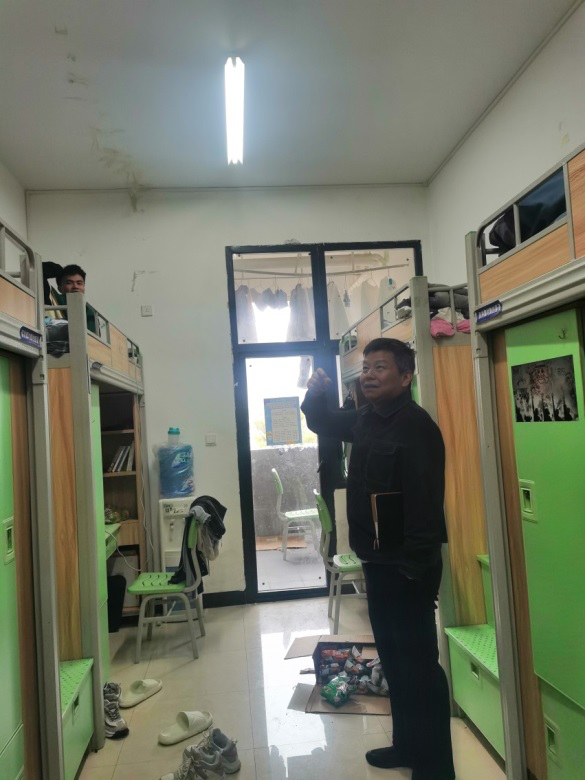 会后党总支书记刘承章带领学院老师去学生宿舍看望同学们,实地了解同学们在寝室的生活、学习情况,为同学们提出很多宝贵的建议。