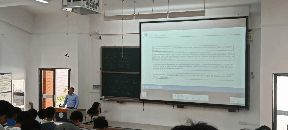 杨晓武从人的感知力、认知力、行为执行力开始讲起,以人为类比,将人的行为赋予到机器之中,生动而形象的为同学们介绍了关于多智能体系分布式协调控制的相关知识。期间,涉及的高数知识、英语知识杨博士先向同学们提问,明白同学们的疑惑,后以简洁明了的语言,及现场黑板演示内容向同学们介绍了相关的知识点,之后又通过PPT再次展示相关内容,以深入浅出的方式让同学们深刻理解本次讲座的核心要义和内容。