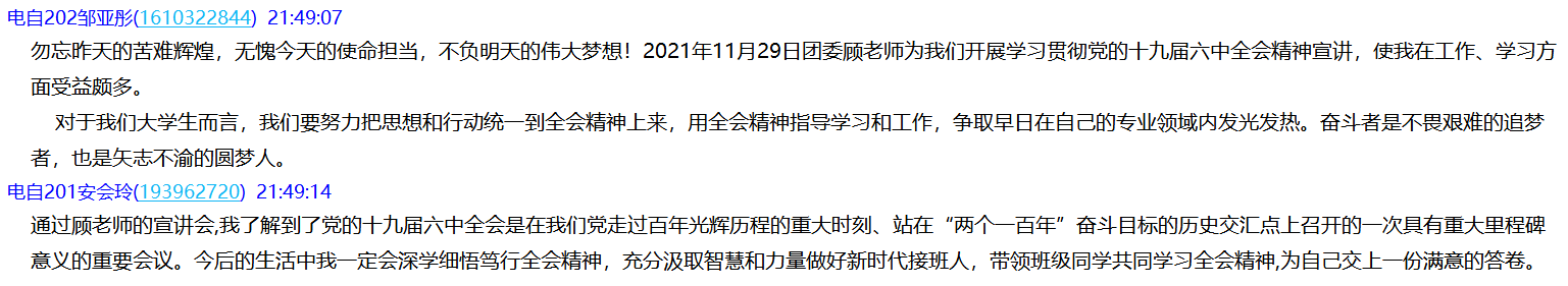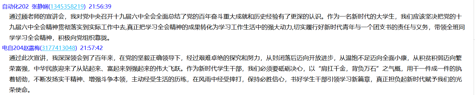 学院团总支全体学生干部、各班团支书、第十七期团校学员共91名同学参加此次云端学习。同学们纷纷表示通过此次十九届六中全会精神的深入学习,大家再次领悟到中国共产党的伟大建党精神和建党百年宝贵的历史经验。同学们表示在今后的学习和生活中,要牢记建党百年十个方面宝贵经验,充分发挥学生干部、团员青年的示范引领作用,坚定把牢政治方向,汲取奋进智慧力量,坚定责任担当展现新作为,青春向党,永远跟党走,为实现中华民族伟大复兴的中国梦贡献青春力量!