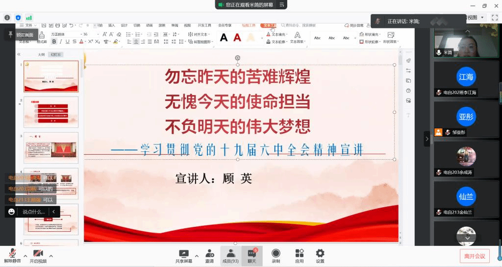 为加强学院学生干部、团员青年思想建设,推动学院团员青年深入学习贯彻党的十九届六中全会精神,营造积极向上的青年风貌,根据《关于开展学习“中国共产党第十九届六中全会精神”特别主题团日活动的通知》(贵理工团发【2021】29号)文件精神相关要求。11月29日20点,我院团总支云端开启十九届六中全会精神宣讲。