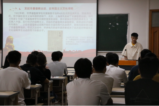 宣讲过程中,刘超以“学好百年团史,凝聚奋进力量——在人民革命运动中发展的青年团”为题,首先向同学们介绍了中国社会主义青年团的成立背景,然后着重向同学们讲解了在中国社会主义青年团投身的第一次工人运动高潮及中国社会主义青年团开展的反帝反封建学生运动中,中国社会主义青年团的成长历程。并引领同学们不忘昨日的苦难与辉煌,无愧今天的使命与担当,不负明天的伟大梦想。积极学习和贯彻中国社会主义青年团在人民革命运动中取得的历史性成就、发生的历史性变革中的革命精神,为续写新时代中国青年的精彩篇章,激昂青春奋斗。