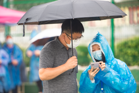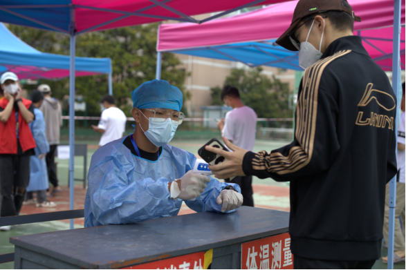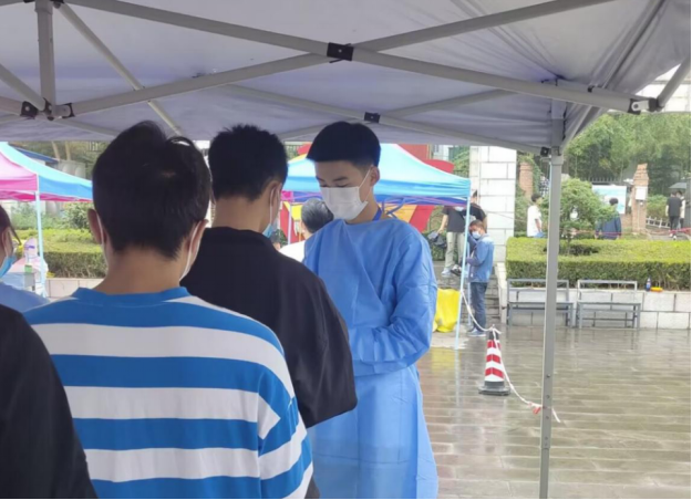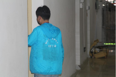 图2志愿者陈航正在敲门提醒同学们做核酸