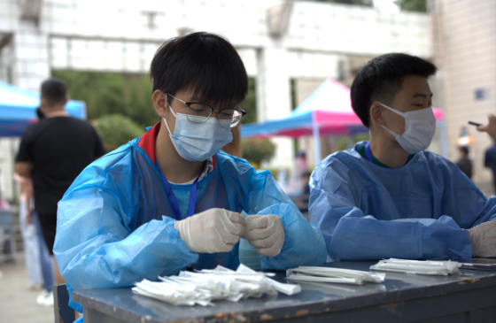 图8志愿者薛濛与谢雨润正在布置核酸点