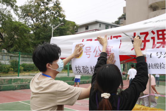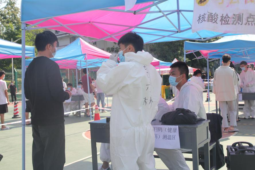 在楼道里、核酸检测点、食堂门口,随处可见的志愿者,“请各位同学打开健康码,保持一米距离排队”,随着提示音的响起,核酸检测开始了,志愿者们指引着同学们有序排队、测温、注册、扫码、登记,与此同时,他们深入每一间寝室,引导同学们有序下楼完成核酸检测;在抗原检测中,他们挨个寝室分发抗原试剂、查看健康码、完成易班校本化扫码,在最短的时间内完成所有同学的检测;物资搬运、秩序维护、核酸点布置、信息登记、答疑解惑……志愿者们紧密配合、认真负责、有条不紊地开展每一项工作。