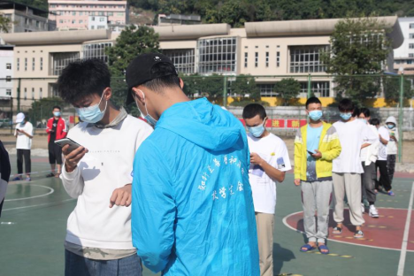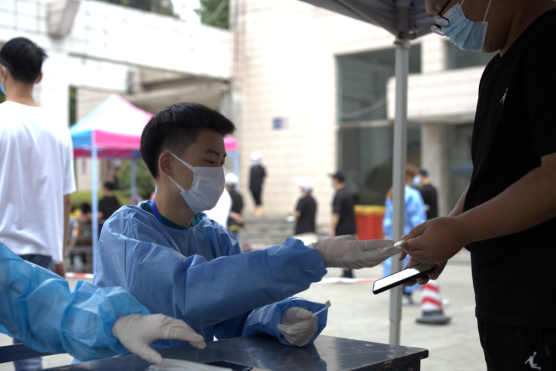 图13志愿者刘超引导同学扫核酸条形码与发放棉签