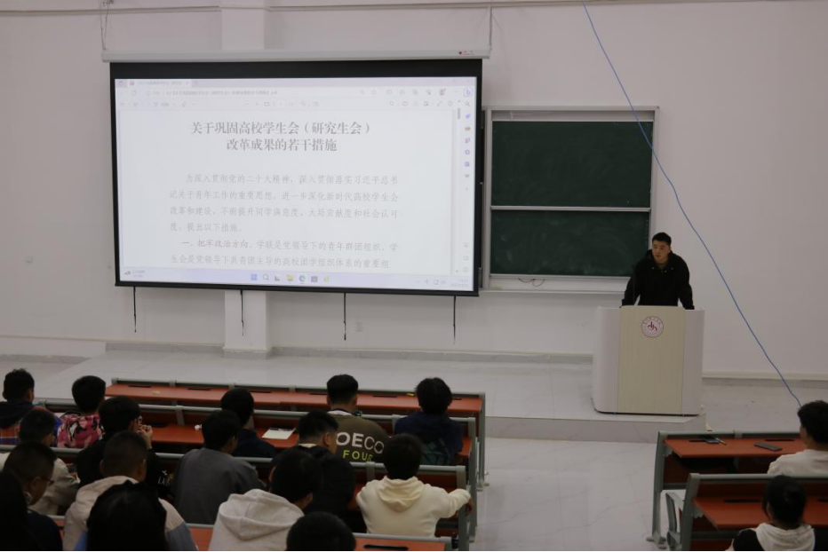 会上,学生会轮值主席成恒富首先对《关于推动高校学生会(研究生会)深化改革的若干意见》的文件要求进行了详细地传答和解读。勉励团总支和学生会工作人员认真领会文件精神,多思考文件中的重点、要点,提升思想格局,加强政治站位,以全心全意服务同学为宗旨,以崭新的精神风貌开展新一届团总支和学生会工作,勇于改革创新,服务同学发展,团结广大青年在实现中华民族伟大复兴中国梦的进程中贡献青春力量。