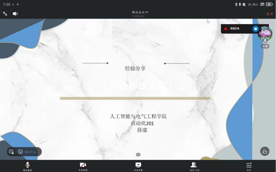 为加强学院学风建设,鼓励同学们积极主动学习,2023年10月30日晚上19点,人工智能与电气工程学院以线上会议的形式对2022、2023级全体同学开展了一次学习经验交流会,会议由我院20级陈为民和薛濛同学作学习经验分享。