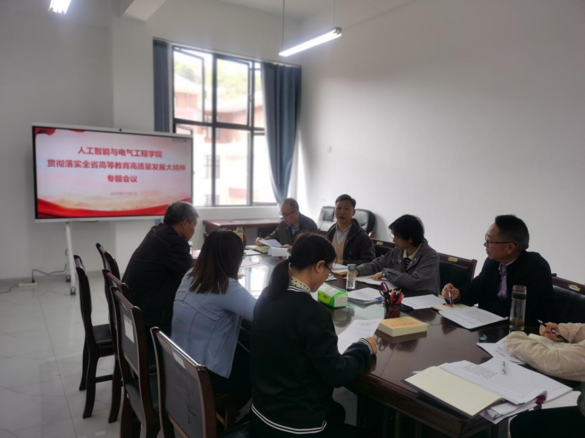 2023年11月2日,为深入学习贯彻落实全省高等教育高质量发展大会精神,全面贯彻党的教育方针,坚持把立德树人作为根本任务,奋力推进学院各项事业高质量发展,人工智能与电气工程学院召开《全省高等教育高质量发展大会精神》专题学习会议。学院领导班子成员孟兰、刘承章、张均、马林联出席会议,院长龙飞主持会议。