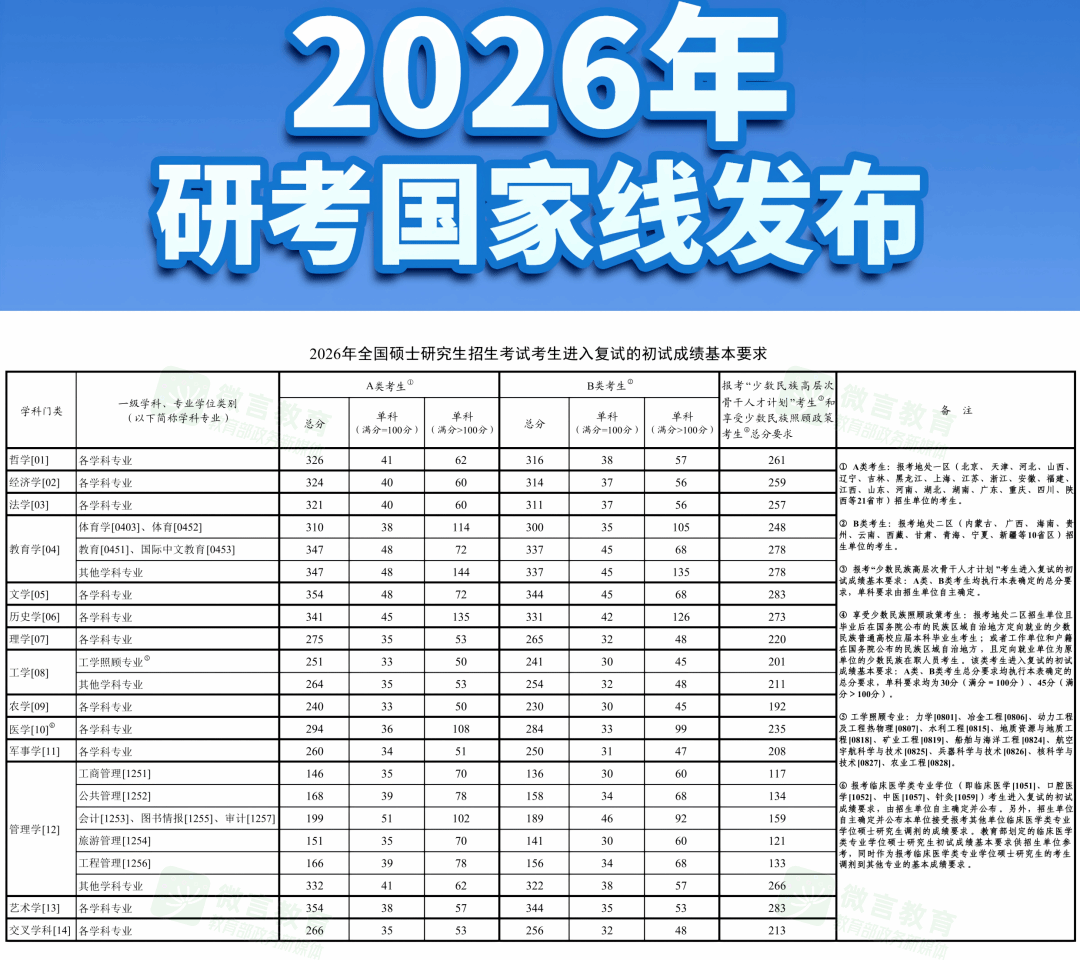 2月28日,教育部发布《2026年全国硕士研究生招生考试考生进入复试的初试成绩基本要求》(国家分数线)。各招生单位根据《2026年全国硕士研究生招生工作管理规定》,在国家分数线的基础上,自主确定并公布报考本单位的考生进入复试的初试成绩要求及其他学术要求。