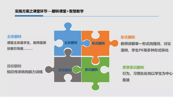 所以各位老师,在课堂环节,通过上述措施,我们实现了课堂主体的转化,主体由教师转化为学生,培养目标也从知识传承转变为能力训练。课堂形式由老师的单一讲解向多种形式转化,伴随着一系列的转化和翻转,老师的思想意识也会发生翻转,我们的行为习惯向以学生为中心靠拢。