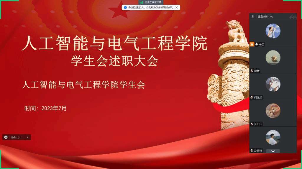 为深入贯彻落实学生会组织深化改革要求,推动完善学生会述职评议制度。2023年7月3日人工智能与电气工程学院学生会通过腾讯会议召开了学生会各部门负责人述职会议。学院团总支书记顾英出席本次会议,学生会主席团成员、各部门负责人参会。