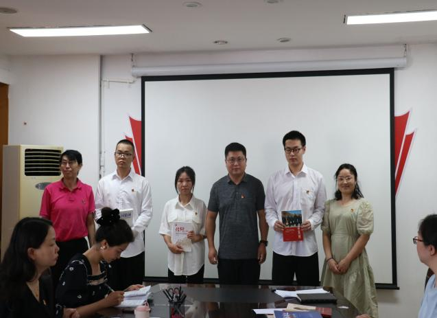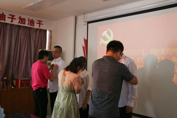 随后,在刘承章同志的带领下,全体党员庄严的举起右手,重温入党誓词。坚定有力的宣誓声,表达着不忘光辉历程,牢记初心使命,坚定跟党走的信心和决心。紧接着,程星晶同志、顾英同志、钟普光同志为新加入党组织的23名预备党员代表佩戴党员徽章。