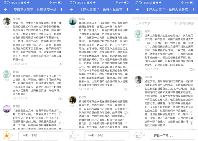 在易班全体党员同志在学习了这两位榜样的英雄事迹后也纷纷发表了各自的学习心得,并在线上积极讨论作为学习党员,应该如何在抗击疫情期间发挥党员先锋模范作用。
