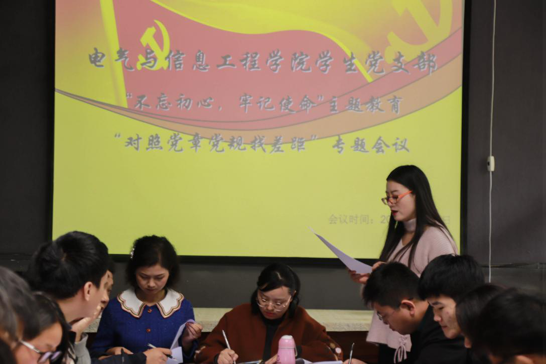 本网讯(电气与信息工程学院 文/侯汝培 图/朱德淘)11月8日下午,电气与信息工程学院学生党支部在蜂巢众创园召开了“不忘初心、牢记使命”主题教育“对照党章党规找差距”专题会议,学院党总支副书记周新国同志莅临指导,学院学生党支部全体党员参加本次会议。会议由学院学生党支部书记郑玉娇主持。