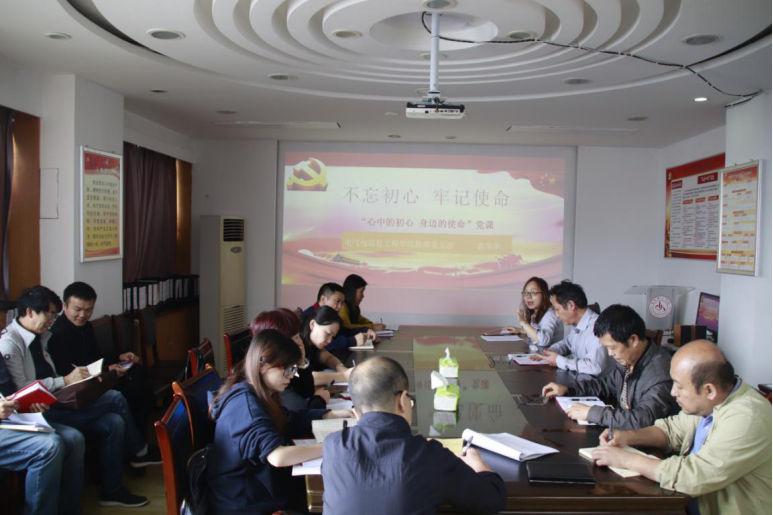 本网讯(电气与信息工程学院 文/刘云龙 图/朱德淘)为贯彻落实“不忘初心、牢记使命”主题教育部署,加强党员党性教育,引导党员自觉增强党的意识、牢记党的宗旨、坚定理想信念,10月11日,我院教师党支部在723会议室组织开展“不忘初心、牢记使命”主题教育专题党课,教师党支部书记郭华华为支部党员作题为“心中的初心 身边的使命”主题党课。学院领导王婷婷、蒋学勤、张均与支部全体党员一道聆听了党课。