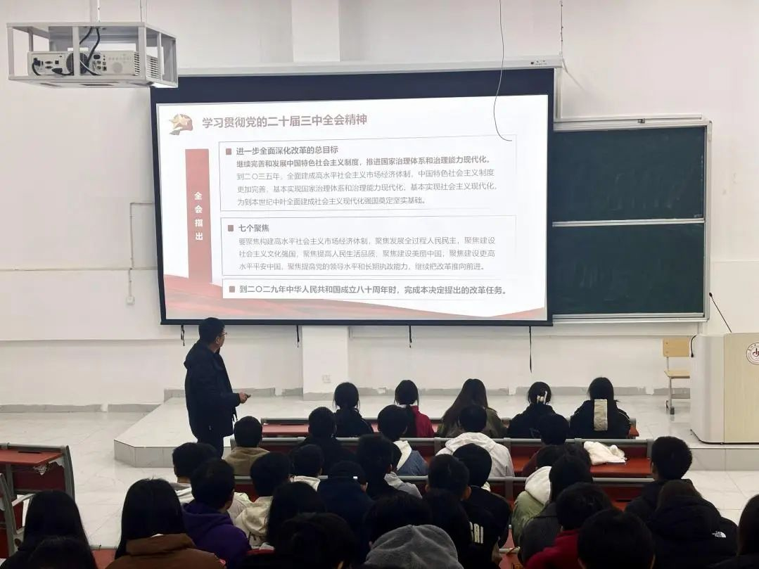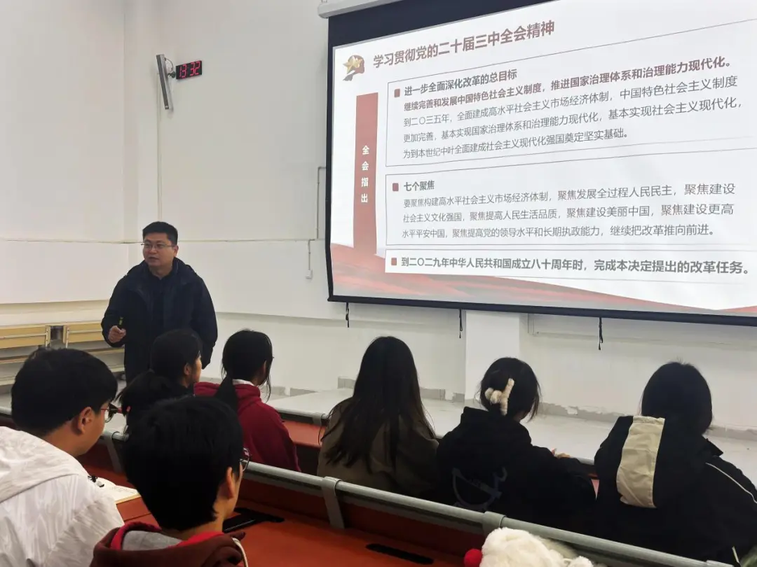 程星晶重点讲解了《中共中央关于进一步全面深化改革、推进中国式现代化的决定》中提出的各项重大举措。他结合学院实际和同学们的学习生活,深入浅出地分析了进一步全面深化改革在经济体制、民主和法治领域、文化体制机制、民生和社会保障制度体系、生态文明体制、国家安全和社会治理体制机制、国防和军队改革、党的领导和党的建设制度等多个方面的具体体现和要求。