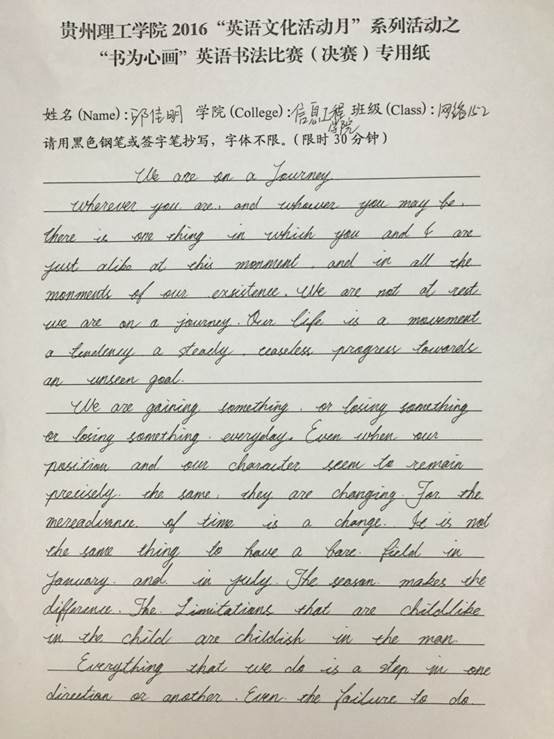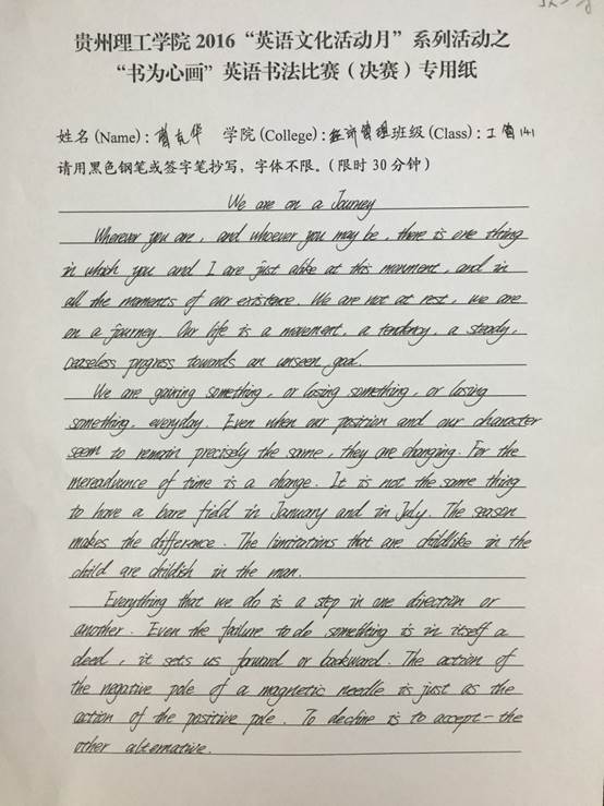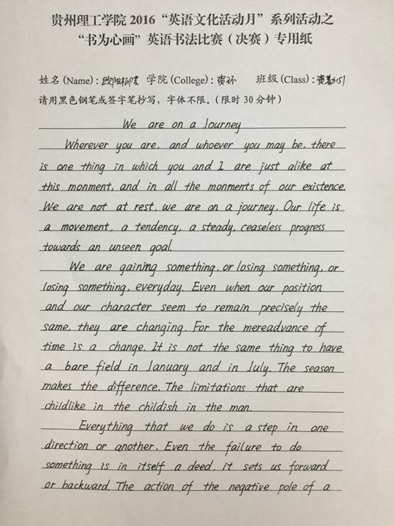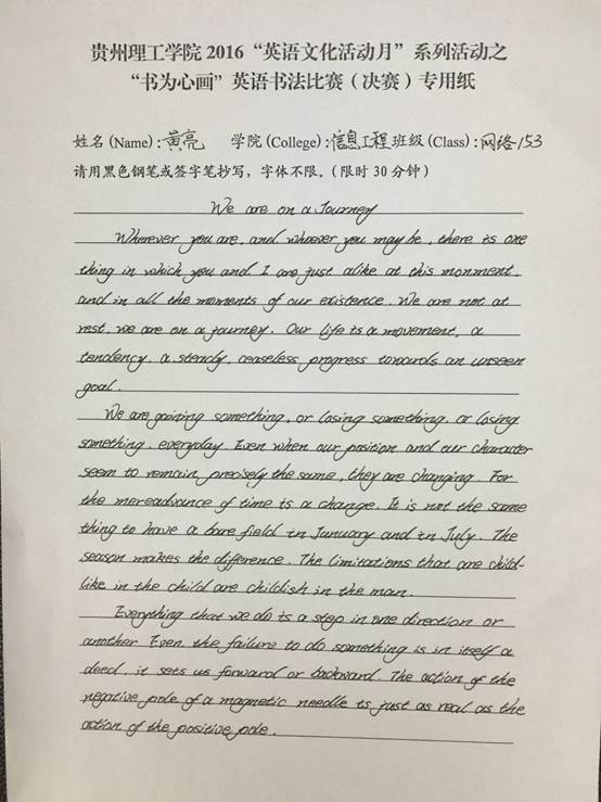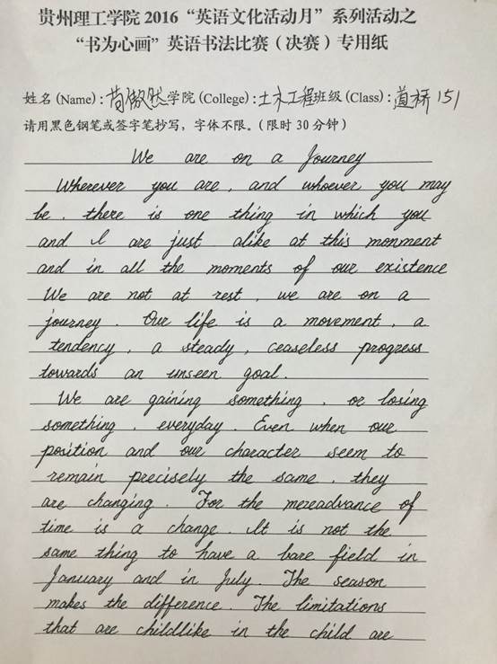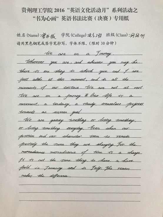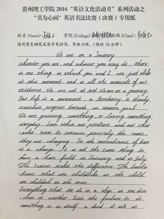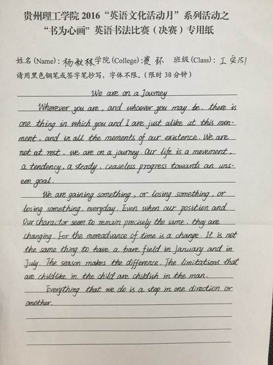 2016年5月31日,大外部、校团委联合主办的2016“英语文化活动月”系列活动之“书为心画”英文书法比赛如期举行,经过评委们客观、认真地评审,共评出一等奖3名、二等奖5名、三等奖8名,优秀奖10名。下面,就让我们一起欣赏同学们美轮美奂的英文书法作品吧!
