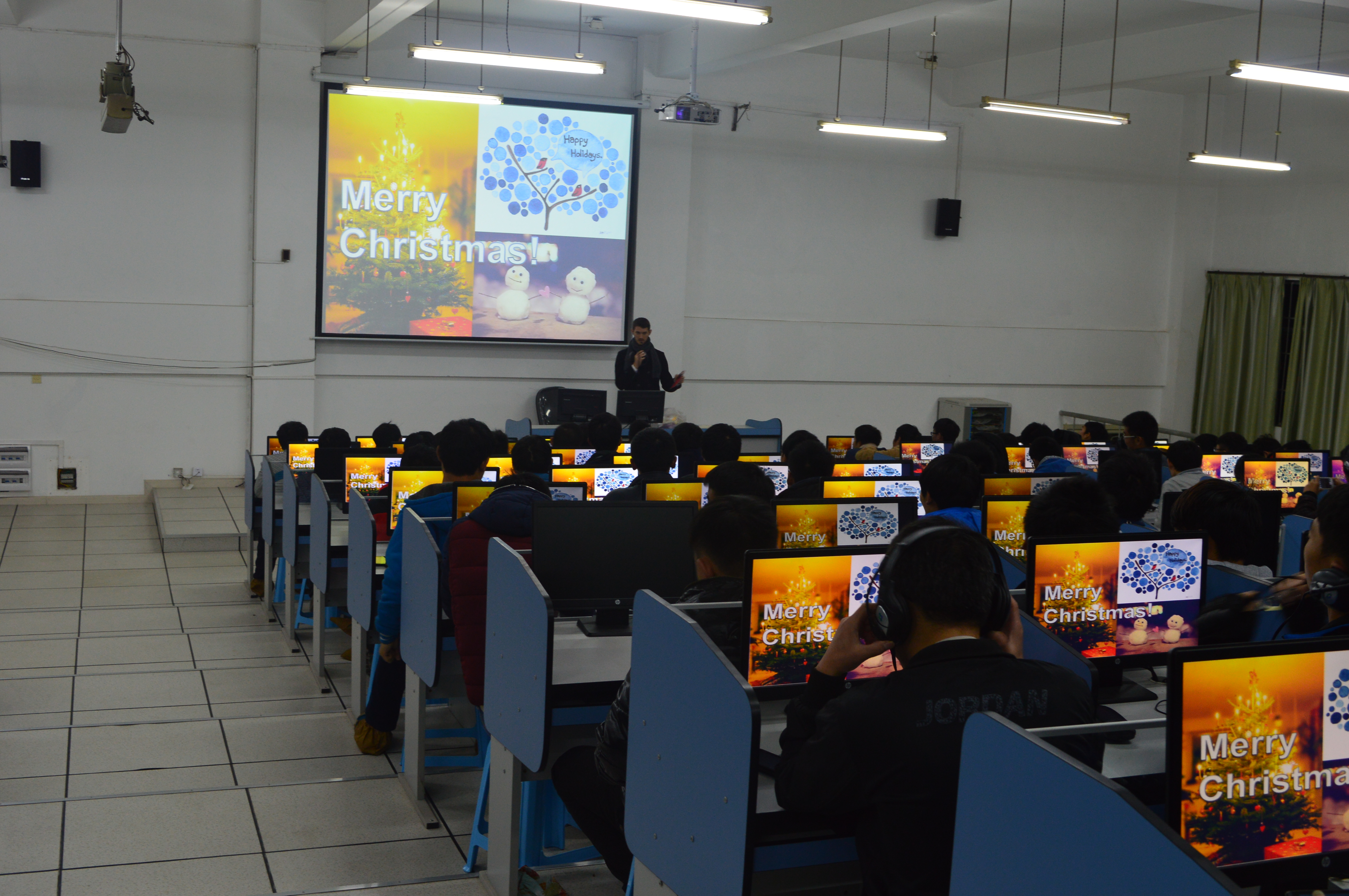12.25日,圣诞节的节日气氛甚是浓厚。大外部外教Adam和教师徐丽丹在第三教学楼五楼语音室举行了讲座。徐老师就大家关心的大学英语四级进行了介绍,分析了题型、各个部分的特点和备考策略。对广大学生面临的听力难题,徐老师强调一定要在学习的过程中培养听一遍就击破的意识,不要寄希望于第二遍第三遍,因为听力除最后一道题其余的都只播放一遍。而就大家关心的备考捷径,她郑重回应:“没有捷径,倒是有方法。掌握方法,认真准备,自然事半功倍。”随后,Adam带领大家了解圣诞节的由来、庆祝传统、与之相关的文化趣事以及涌现出来的社会问题。他夸张精彩的展示博得了阵阵掌声。在紧接的抢答环节,学生们反应敏捷,回答准确,为自己的表现赢得圣诞节小礼品颇为自豪。本次讲座在积极温馨的氛围里结束。