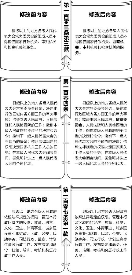 第五十条 宪法第一百零四条中“监督本级人民政府、人民法院和人民检察院的工作”修改为“监督本级人民政府、监察委员会、人民法院和人民检察院的工作”。这一条相应修改为:“县级以上的地方各级人民代表大会常务委员会讨论、决定本行政区域内各方面工作的重大事项;监督本级人民政府、监察委员会、人民法院和人民检察院的工作;撤销本级人民政府的不适当的决定和命令;撤销下一级人民代表大会的不适当的决议;依照法律规定的权限决定国家机关工作人员的任免;在本级人民代表大会闭会期间,罢免和补选上一级人民代表大会的个别代表。”