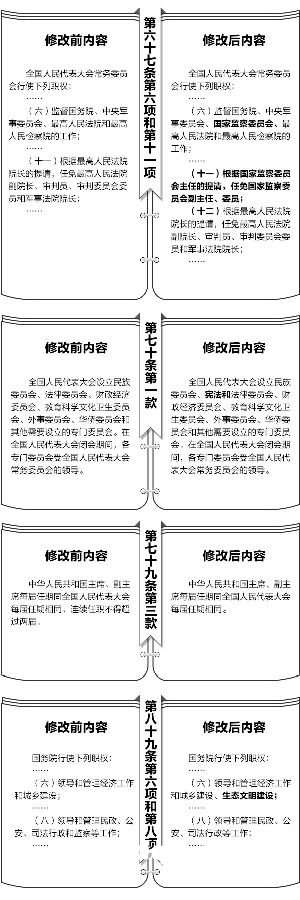 第四十四条 宪法第六十七条“全国人民代表大会常务委员会行使下列职权”中第六项“(六)监督国务院、中央军事委员会、最高人民法院和最高人民检察院的工作”修改为“(六)监督国务院、中央军事委员会、国家监察委员会、最高人民法院和最高人民检察院的工作”;增加一项,作为第十一项“(十一)根据国家监察委员会主任的提请,任免国家监察委员会副主任、委员”,第十一项至第二十一项相应改为第十二项至第二十二项。