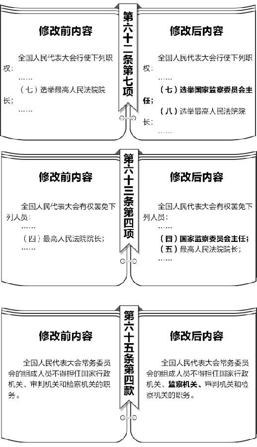 第四十三条 宪法第六十五条第四款“全国人民代表大会常务委员会的组成人员不得担任国家行政机关、审判机关和检察机关的职务。”修改为:“全国人民代表大会常务委员会的组成人员不得担任国家行政机关、监察机关、审判机关和检察机关的职务。”