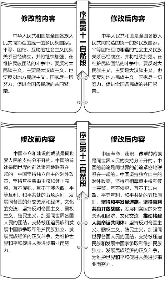 第三十五条 宪法序言第十二自然段中“中国革命和建设的成就是同世界人民的支持分不开的”修改为“中国革命、建设、改革的成就是同世界人民的支持分不开的”;“中国坚持独立自主的对外政策,坚持互相尊重主权和领土完整、互不侵犯、互不干涉内政、平等互利、和平共处的五项原则”后增加“坚持和平发展道路,坚持互利共赢开放战略”;“发展同各国的外交关系和经济、文化的交流”修改为“发展同各国的外交关系和经济、文化交流,推动构建人类命运共同体”。这一自然段相应修改为:“中国革命、建设、改革的成就是同世界人民的支持分不开的。中国的前途是同世界的前途紧密地联系在一起的。中国坚持独立自主的对外政策,坚持互相尊重主权和领土完整、互不侵犯、互不干涉内政、平等互利、和平共处的五项原则,坚持和平发展道路,坚持互利共赢开放战略,发展同各国的外交关系和经济、文化交流,推动构建人类命运共同体;坚持反对帝国主义、霸权主义、殖民主义,加强同世界各国人民的团结,支持被压迫民族和发展中国家争取和维护民族独立、发展民族经济的正义斗争,为维护世界和平和促进人类进步事业而努力。”