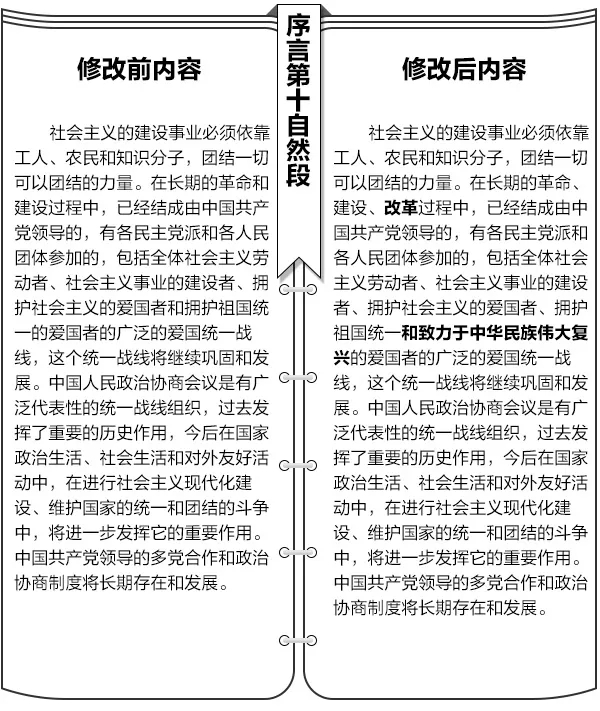 第三十三条 宪法序言第十自然段中“在长期的革命和建设过程中”修改为“在长期的革命、建设、改革过程中”;“包括全体社会主义劳动者、社会主义事业的建设者、拥护社会主义的爱国者和拥护祖国统一的爱国者的广泛的爱国统一战线”修改为“包括全体社会主义劳动者、社会主义事业的建设者、拥护社会主义的爱国者、拥护祖国统一和致力于中华民族伟大复兴的爱国者的广泛的爱国统一战线”。这一自然段相应修改为:“社会主义的建设事业必须依靠工人、农民和知识分子,团结一切可以团结的力量。在长期的革命、建设、改革过程中,已经结成由中国共产党领导的,有各民主党派和各人民团体参加的,包括全体社会主义劳动者、社会主义事业的建设者、拥护社会主义的爱国者、拥护祖国统一和致力于中华民族伟大复兴的爱国者的广泛的爱国统一战线,这个统一战线将继续巩固和发展。中国人民政治协商会议是有广泛代表性的统一战线组织,过去发挥了重要的历史作用,今后在国家政治生活、社会生活和对外友好活动中,在进行社会主义现代化建设、维护国家的统一和团结的斗争中,将进一步发挥它的重要作用。中国共产党领导的多党合作和政治协商制度将长期存在和发展。”