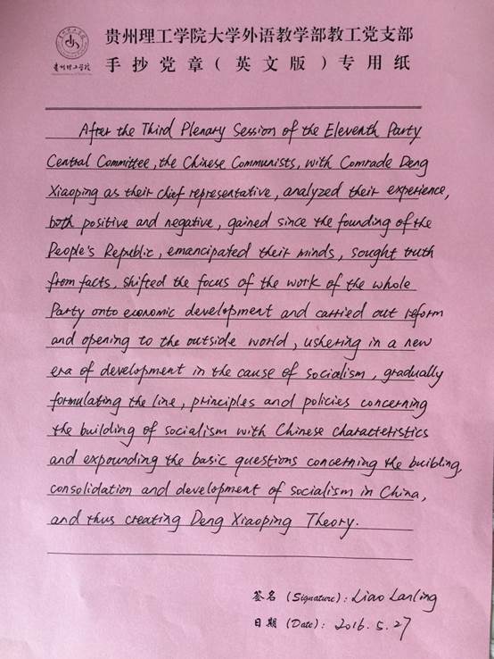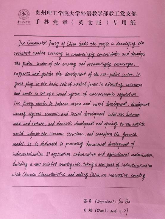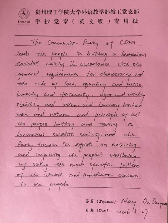 此次活动主要目的是引导本部门教职工党员认真学习理解党章,严格遵守党章,推动 “两学一做”学习教育扎实有效开展。大学外语教学部结合本部门工作实际积极创新学习形式,组织党员教工抄写中英文版党章。通过认真抄写党章,既使全体教职工对党的章程得到进一步加深,党性修养得以进一步提升,也有效锻炼了大外部教师的外语能力,真正做到了“两不误、两促进”。