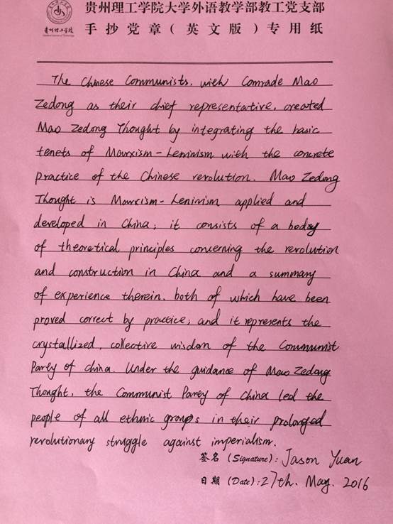 大外部全体党员教职工认真参加了手抄英文版党章活动,在党总支的号召下,教学部的几名非党员教工也参加了手抄英文党章活动。大家的手抄党章,书写工整、字体规范,有的还体现了浓浓的“书法味”,充分展现了大外教师良好的基本功。大家表示,这样的手抄党章有创新、有创意,颇具大外特色。在今后的工作中,要进一步深化对党章的认识和理解,始终忠诚党的教育事业,努力做一名合格乃至优秀的大学教师。