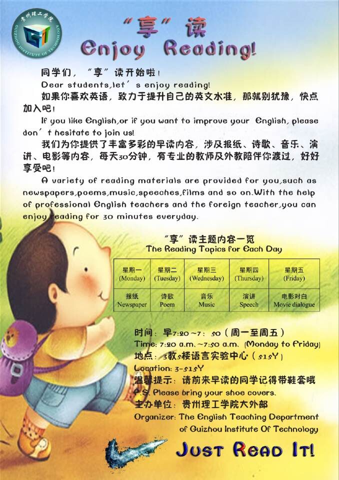 随着2014年下学期接近尾声,贵州理工学院大外部的“享读”活动圆满结束。“享读”即为享受阅读,享受朗读。此活动以激发学生学习英语的兴趣为出发点,由大外部组织在第三教学楼的语音室进行,时间是每个工作日的7:20-7:50。内容和形式涉及新闻、情景对话、演讲、小故事、电影对白、口语、诗歌等,引导此活动的为大外部的教师和外教Adam。学生们的积极性很高,坚持到底的同学表示收获不少。一是每天早上的早起和参与锻炼了意志,二是和其他同学一起参与英语早读练习了英文。“一个人容易懒散,起不了床,早上也就荒废了。但是参与这个活动比较有氛围,大家都那么积极地学习感染了我。而且,我觉得语言还是说出来比较有感觉。”有同学受访的时候表示。希望贵州理工学院以后有更多的学子真正享受阅读带来的乐趣。