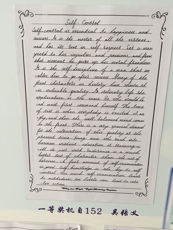 书法非一日之功。通过此次英语硬笔书法比赛,在校园里掀起了一股英语书写风,同学们比学赶超,促进了彼此间的学习与交流,激发了英语学习的热情和活力,为广大学生英语学习营造了良好氛围。