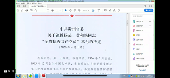 苏博同志首先带领全体党员同志学习贵州省优秀共产党员杨荣、黄和艳先进事迹。杨荣、黄和艳同志是在新冠肺炎疫情防控工作一线勇于担当、无私奉献、英勇奋战的党员干部优秀代表。他们迎难而上、勇挑重担、冲锋在前,视群众如亲人,视疫情如命令,充分发挥共产党员先锋模范作用,在疫情防控工作的最前沿砥砺忠诚干净担当的优秀品质。他们工作务实、敢于担当、乐于奉献,把个人理想和奋斗融入当地的发展,为保障人民群众生命安全和身体健康作出重大贡献。