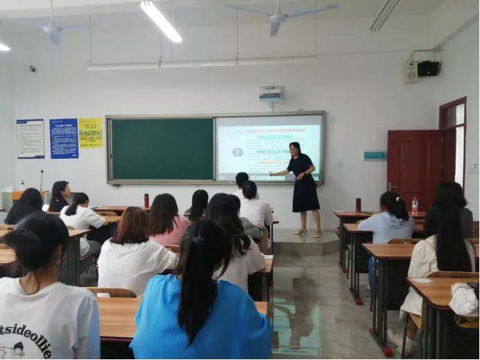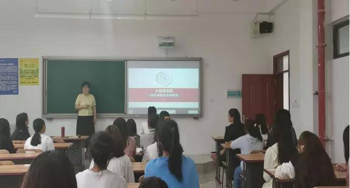 院长周丽给同学们讲解了贵州理工学院校徽、校训、校歌等方面知识,介绍了外国语学院的发展情况,通过“大学是什么”“大学学什么”的问题引导同学们深入思考,指导同学们对大学树立正确的认识,希望同学们“学好外国语,做好中国人”。