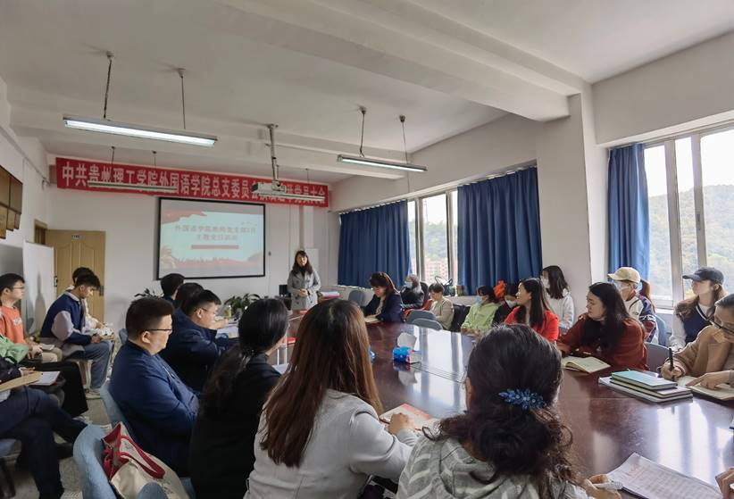 本网讯(外国语学院 彭立飞)3月25日下午,外国语学院教师党支部开展了以“坚定理想信念、勇当栋梁之才”为主题的三月主题党日活动。活动由教师党支部书记冯建平主持,外国语学院全体党员及入党积极分子参加。