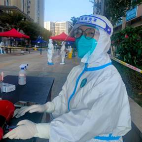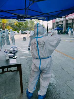 外国语学院教师舒馨瑶作为小区居民志愿者的工作主要是负责辅助群众正确地扫核酸采集试管码。她诙谐地说:我是志愿者中最会“揽客”的人,总共有四组核酸采集点,我在第2组,一见到远处有居民来了,向他们挥手,呼喊他们快来我们这里,我们这里速度最快,不用排长队。就这样,第一天早上她所在点服务了560人,是扫码人数最多的组。她发自内心地讲道,大白们只有一个愿望:加快速度努力战斗,让疫情早日消散。