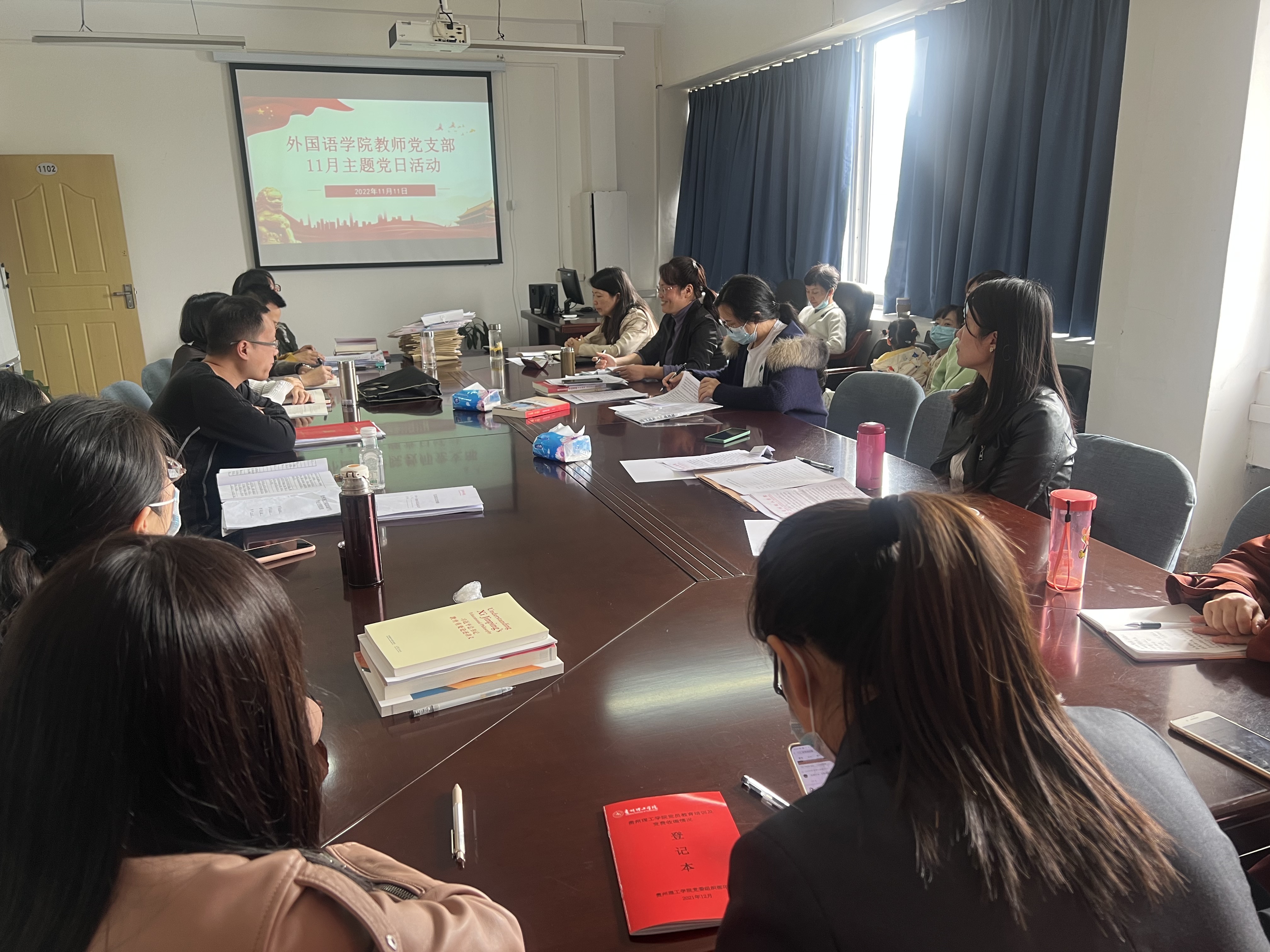 本网讯(外国语学院 张郁佳)2022年11月11日,外国语学院教师党支部在行政楼1102会议室开展了以“学思践悟二十大 砥砺奋进新征程”为主题的十一月主题党日活动。活动由教师党支部书记冯建平主持,外国语学院全体党员教师参加。
