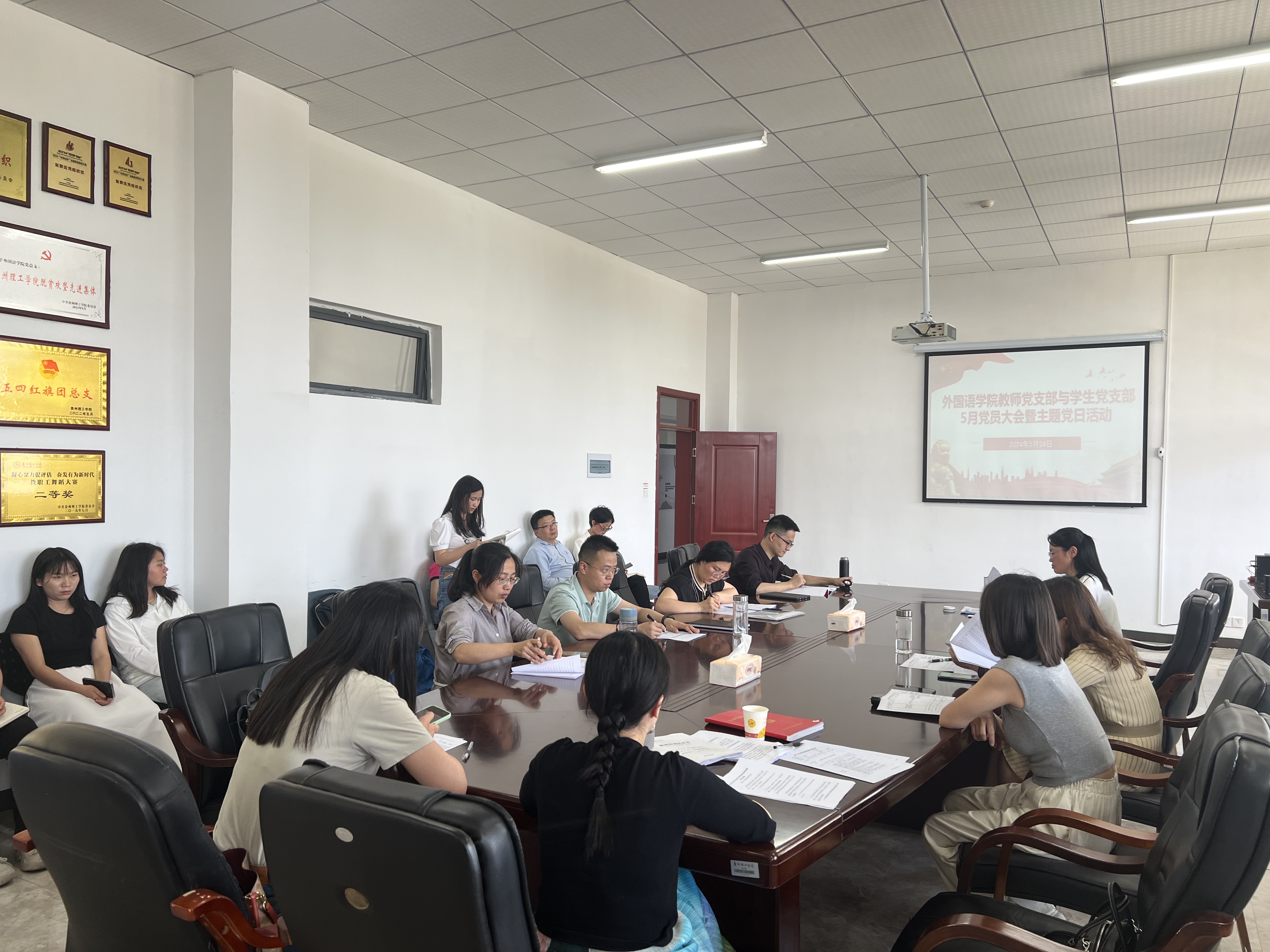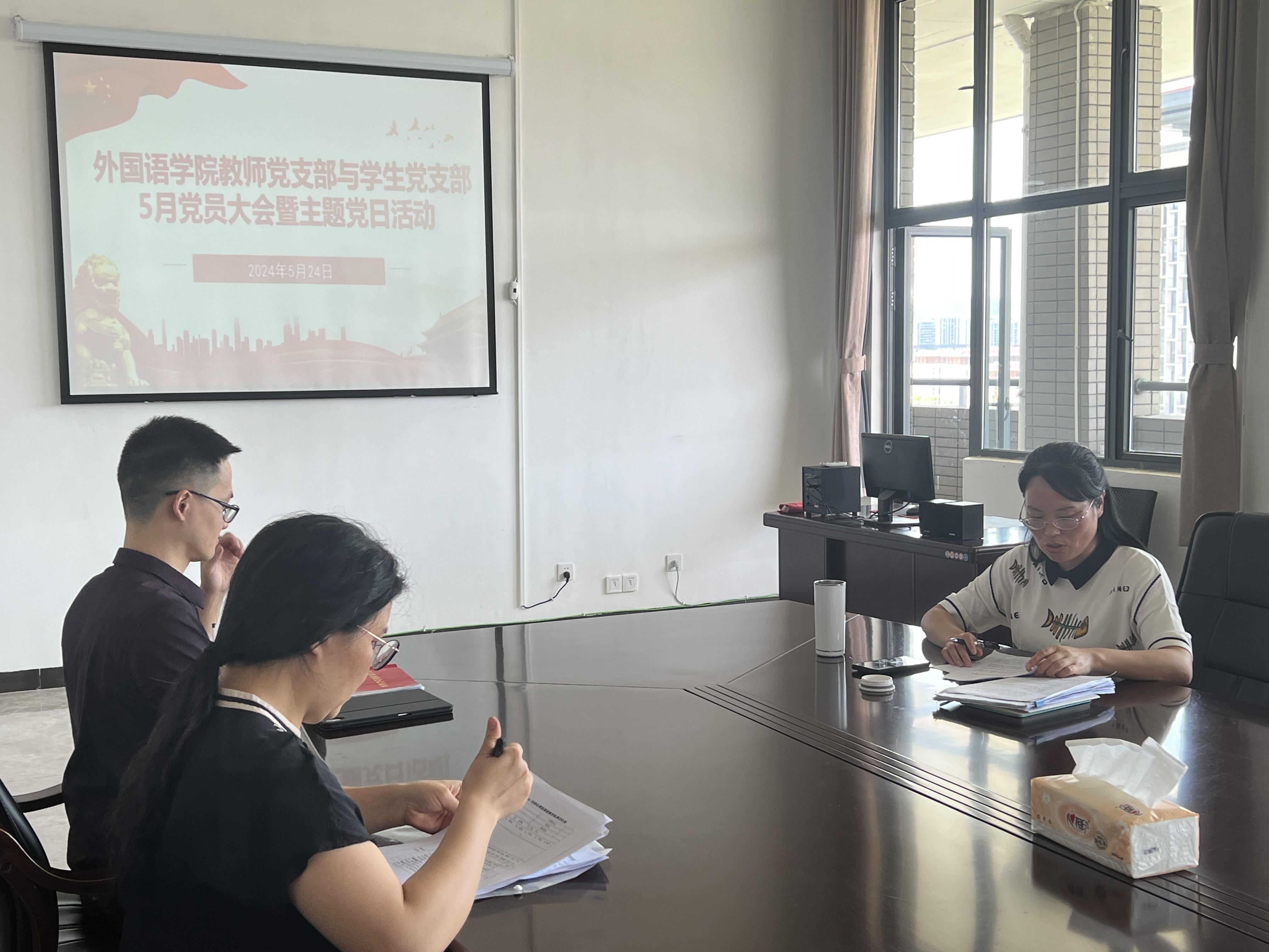 本网讯(外国语学院 张郁佳)2024年5月24日,外国语学院教师党支部与学生党支部在开物楼1524会议室、四号公寓五楼“乐学驿站”召开了党员大会暨以“党纪学习教育”为主题的五月主题党日活动。会议由教师党支部书记冯建平主持,外国语学院教师党支部与学生党支部全体党员参加。