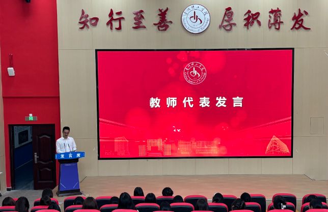 校级优秀教师邓冶作为教师代表发言,他结合自身教学经历,鼓励新生们在外国语学院这片沃土上,积极探索语言的无穷魅力,以勤奋和热爱开启学习探索之旅。