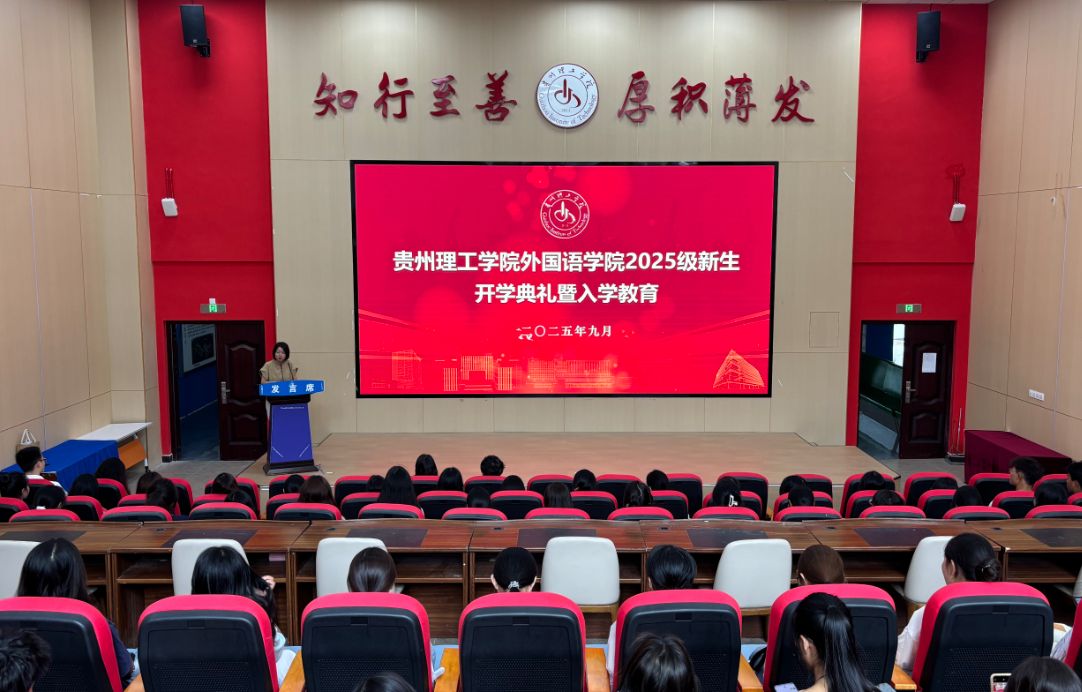 本网讯(外国语学院 黄超禹)2025年9月12日下午,贵州理工学院外国语学院在孵化园创新创业中心206厅举行2025级新生开学典礼暨入学教育。学院党总支书记徐焱、院长周丽、2025级辅导员、班主任老师、教师代表以及全体2025级新生齐聚一堂,共同开启新生们的大学篇章,典礼由党总支副书记杜玉红主持。