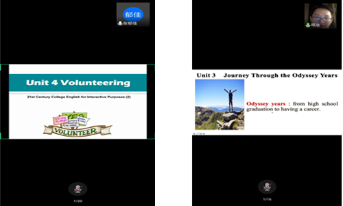在课程思政示范微课展示环节,张郁佳老师讲授了目前使用的教材中Unit 4 Volunteering的课文导入部分,邓冶老师讲授Unit 3 Journey Through the Odyssey Years中作者写作对比手法的应用,两个课程都以“润物细无声”的方式融入了课程思政内容。